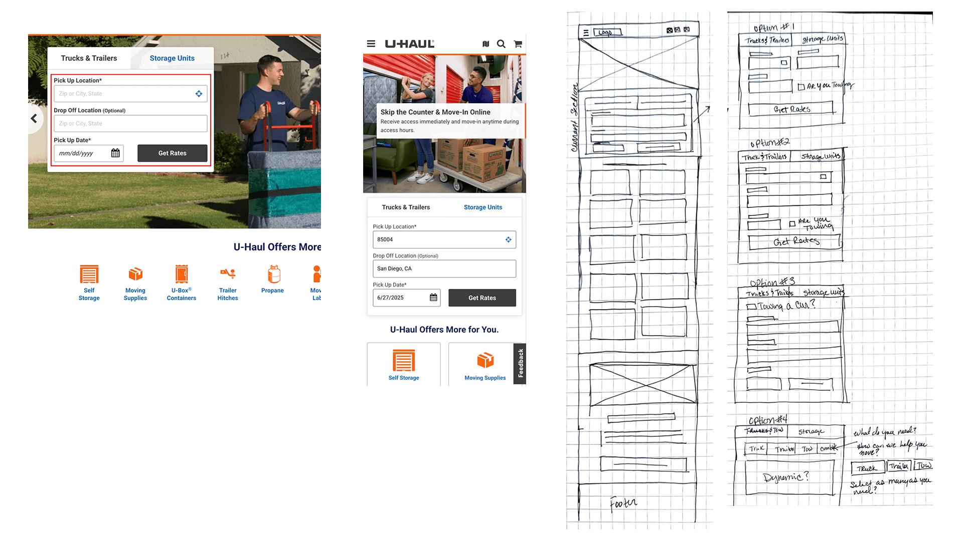 To address usability concerns, I sketched the existing mobile layout to map pain points. Users start by entering location and dates. The small “Tow My Car” checkbox on the results page redirects to “Truck & Towing” if selected.