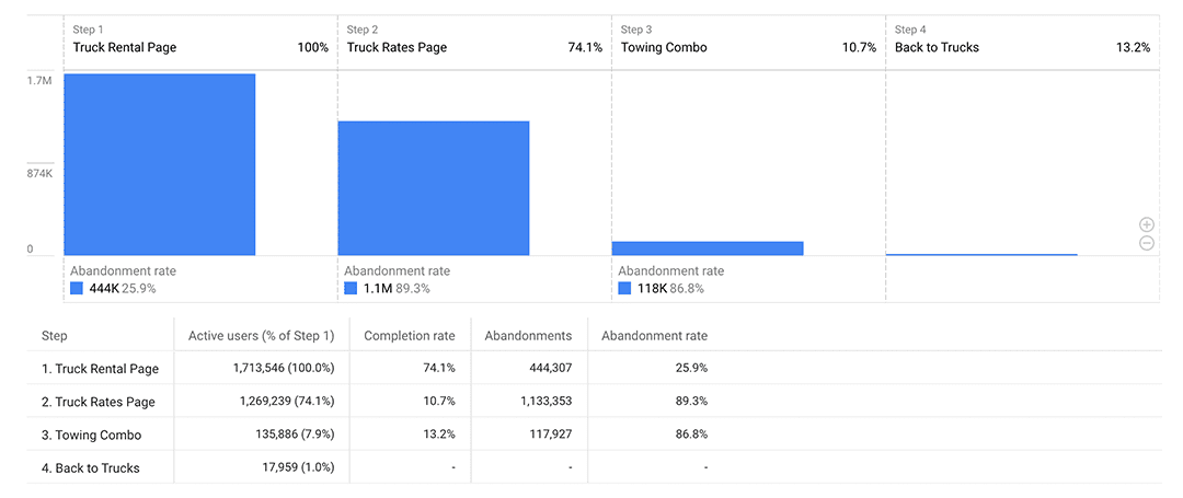 - Truck Rental Page > Truck Rates Page: About 74% of users continued. Roughly 26% abandoned at this point.